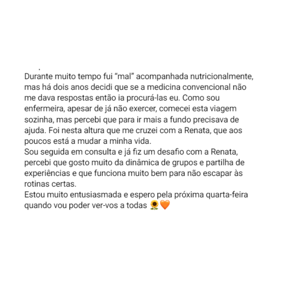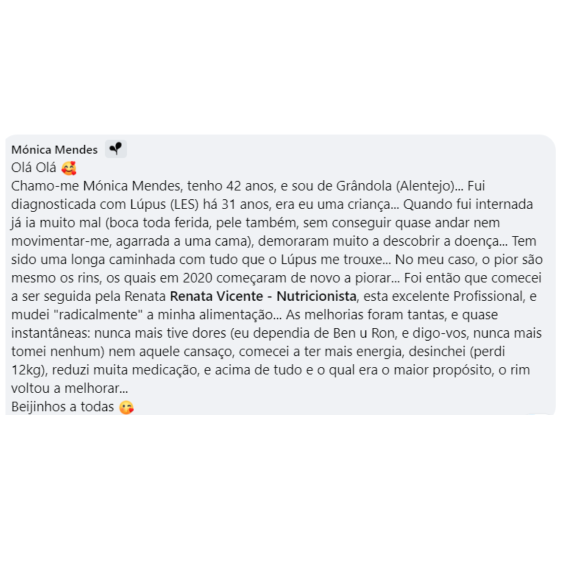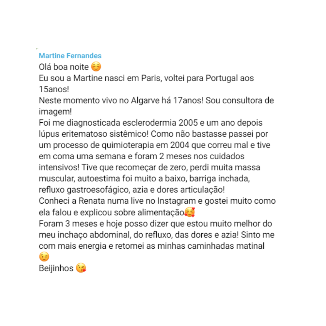 Nesta jornada, já acompanhei mais de 200 mulheres com condições autoimunes e reumáticas na melhoria da sua condição de saúde e os resultados têm sido vários: alcance mais rápido da remissão, diminuição da necessidade de medicação e dos efeitos secundários da mesma, redução da dor, inflamação, aumento da energia, melhoria da saúde intestinal, mais qualidade de vida, entre outros!