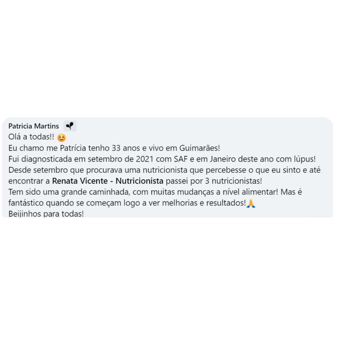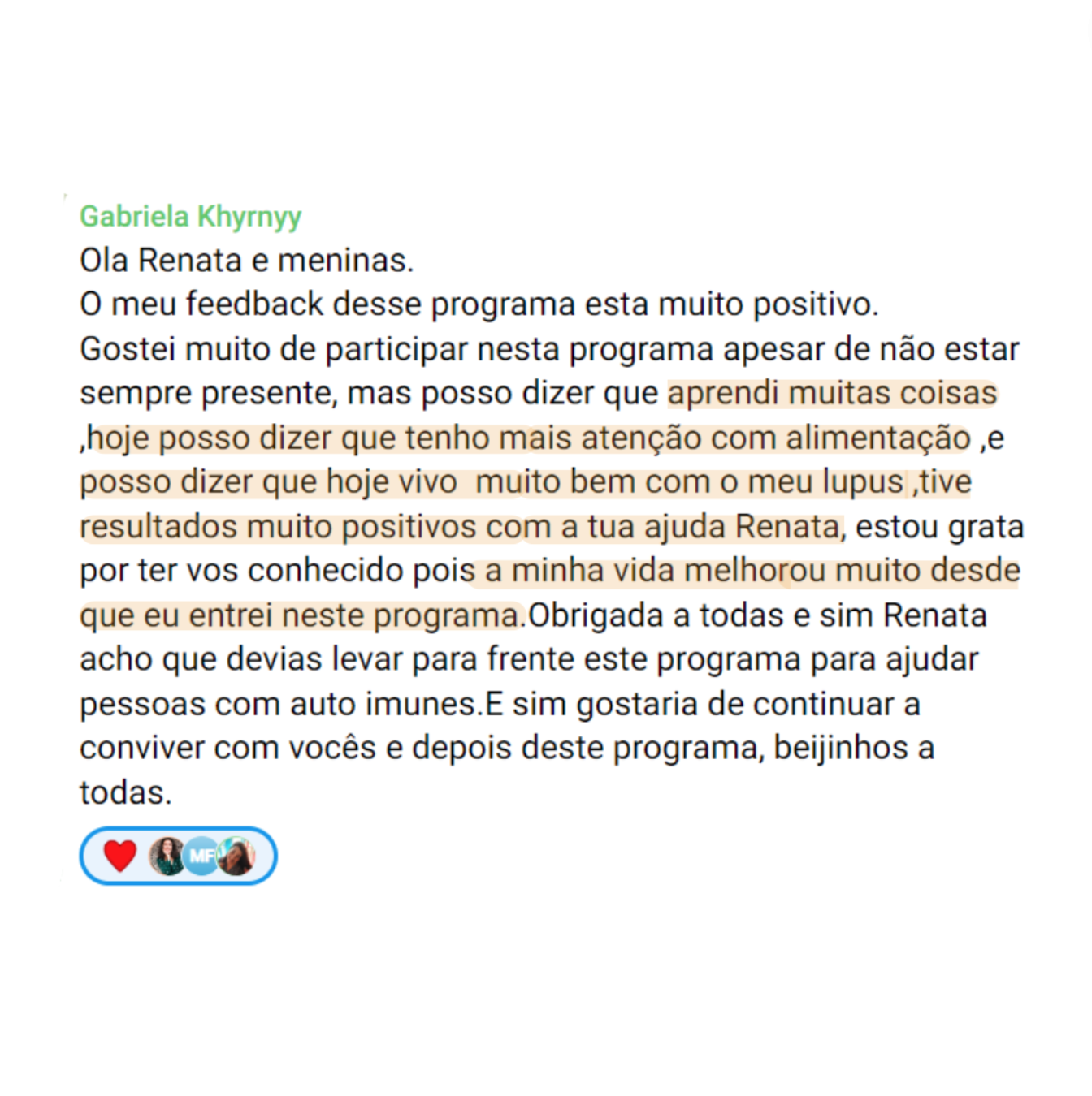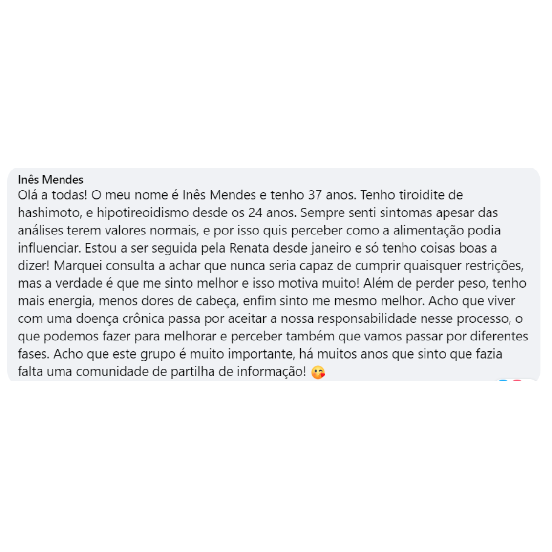 Nesta jornada, já acompanhei mais de 200 mulheres com condições autoimunes e reumáticas na melhoria da sua condição de saúde e os resultados têm sido vários: alcance mais rápido da remissão, diminuição da necessidade de medicação e dos efeitos secundários da mesma, redução da dor, inflamação, aumento da energia, melhoria da saúde intestinal, mais qualidade de vida, entre outros!